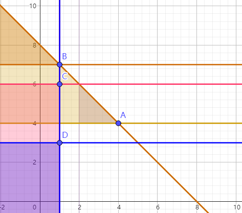 直接做询问矩形与修改三角形的交比较复杂。将一次修改差分为两个没有左边界的等腰三角形和两个没有左/下边界矩形,将询问差分为四个没有右/上边界的矩形。这样询问和修改的交都只是等腰三角形。